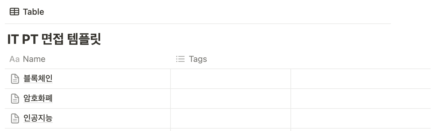 PT 면접의 경우 블록체인, AI 등 가장 나올법한 주제들 중심으로 아래 템플릿에 맞게 노션에 정리해 두고 보았습니다! 달달 외우기엔 당일 어떤 주제가 나올지도 모르는 상황이었기에 어떤 주제가 나오든 어느정도 설명은 할 수 있도록 가볍게 알고 가려고 했던 것 같습니다