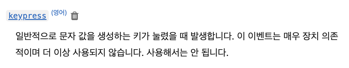 우선 저는 임시 방편으로 keypress로 해결했는데 mdn을 보니 이런 무시무시한 문구가 있더라구요 ㅎ.. 나중에 발견